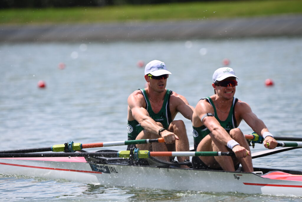 After yesterday’s postponement the men’s double sculls had another slight delay for the lanes to be reallocated, with the fastest crews in lane 6 to account for a cross headwind. Semifinal 1 went according to the playbook, with Olympic champions Romania, Andrei Cornea and Marian Enache, leading out from the outside lane and posting the quickest time of the two races, 6:31.08. Ireland stuck with them throughout to finish second, with Spain third and Italy’s former lightweights unable to close the gap.